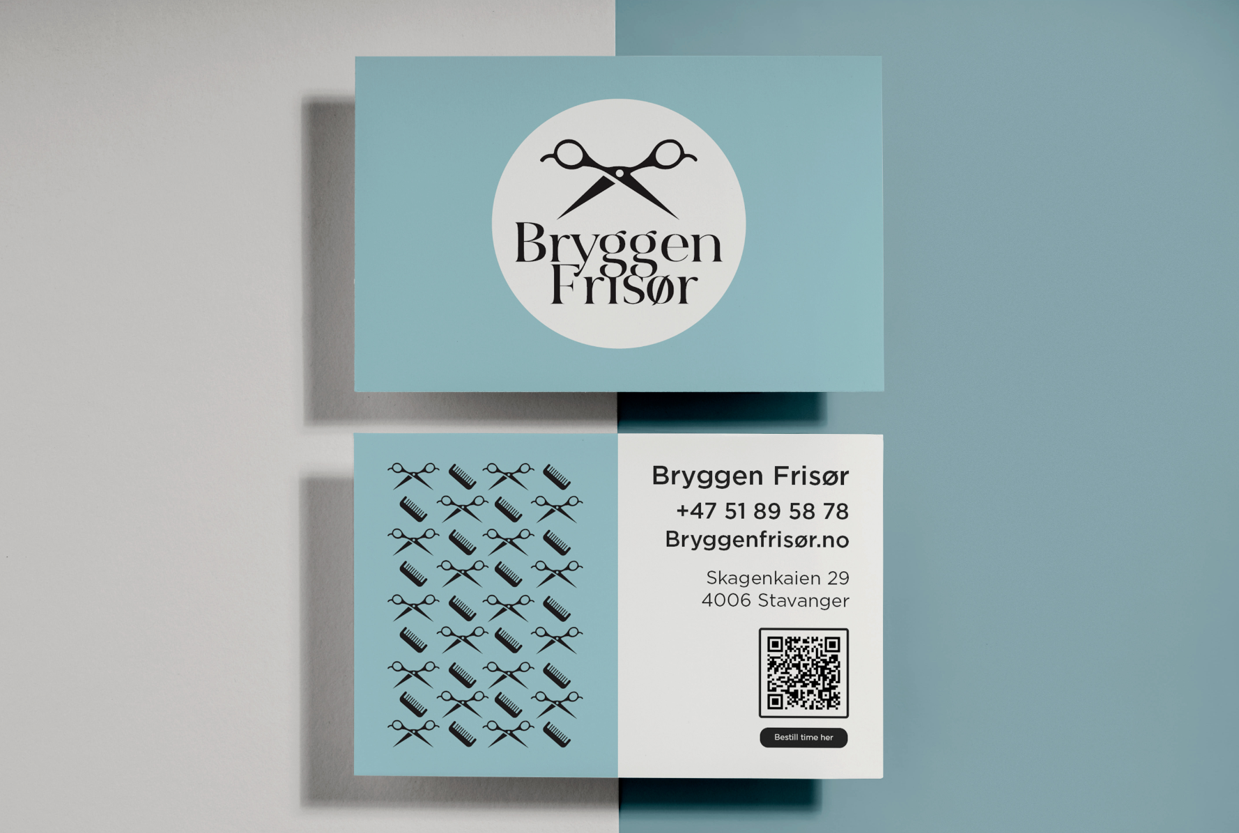 Visittkortene kombinerer det grafiske mønsteret med ren typografi og en QR-kode som gjør det enkelt for kunder å bestille time direkte.